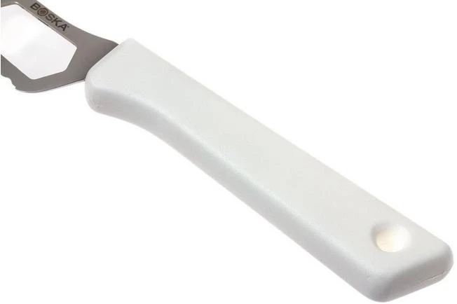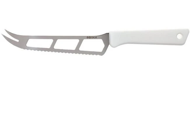 This Boska all-rounder with white handle is a part of the HACCP collection of cheese knives. The strength of this cheese knife can be found in the versatile blade. This 14 cm long blade has three holes in the blade to make sure cheese won’t stick to the surface, a serrated edge with which you easily cut through cheese and a forked tip to serve pieces of cheese. It is clear: this cheese knife is a real all-rounder.