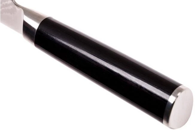 The Kai Shun Classic series consists of beautiful kitchen knives with 32-layer damask steel. The VG-MAX core takes care of unparalleled cutting properties. The handles are made of laminated pakkawood and have an asymmetrical shape. This knife series is one of the most extensive series in the world. Because of its look and feel and ultimate cutting properties this knife is an absolute joy to behold and amazing to use. Santoku knife from the Shun series.