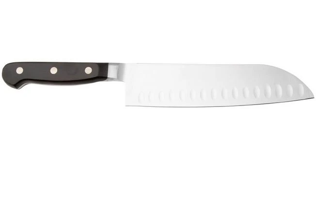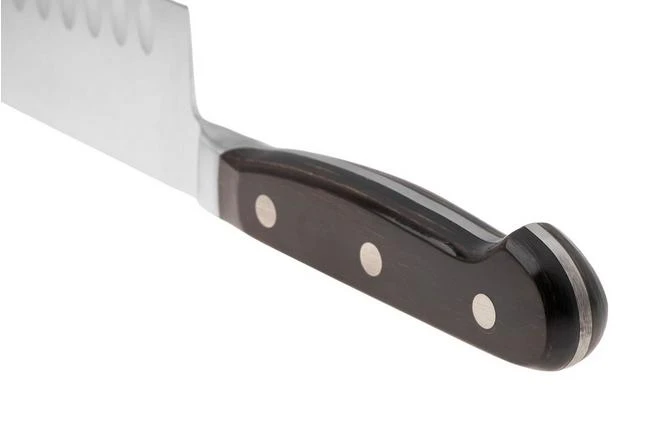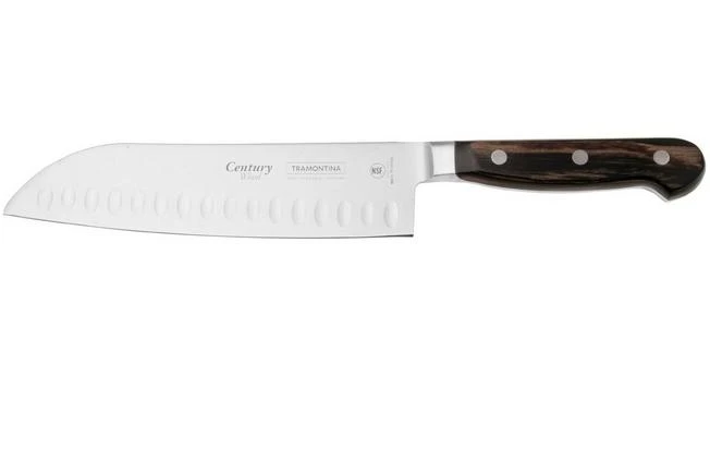 The Tramontina Century Wood 21542197 santoku is a very versatile kitchen knife. A santoku is the Japanese version of the European chef’s knife. The blade is perfect when finely cutting vegetables, meat, fish, onion, garlic and, of course, different types of herbs. The dimples in the blade ensure that ingredients don’t stick to the blade.