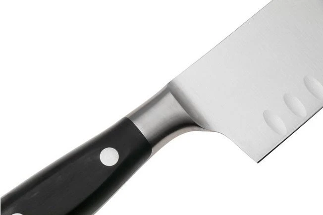 The Victorinox Grand Maître Santoku Knife 7.7323.17G, POM, dimpled santoku, 17 cm is a versatile kitchen knife. A santoku is the Japanese version of the European chef’s knife. The blade is perfect when finely cutting vegetables, meat, fish, onion, garlic and, of course, different types of herbs. The dimples in the blade ensure that ingredients don’t stick to the blade.