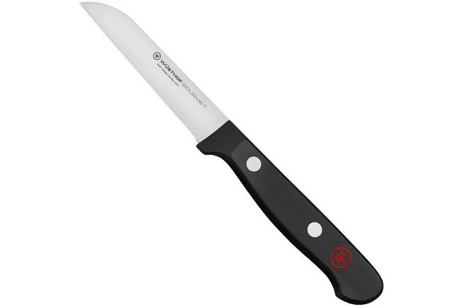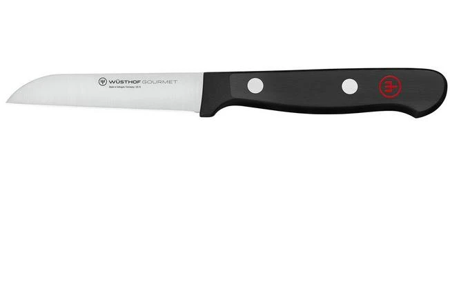 This Wüsthof Gourmet peeling knife is a small but versatile knife with a thin blade and smooth edge. This vegetable knife is made to cut onions and herbs, but is also great when chopping, cleaning and decorating fruit and vegetables. The difference with the other 8 cm peeling knife from the Gourmet collection can be found in the tip. While the other peeling knife is enhanced with a pointed tip, this peeling knife has