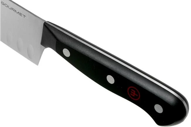 With this Wüsthof Gourmet Santoky knife with dimples 17 cm you will have the perfect knife close for the more detailed tasks in the kitchen. Specifically developed to prepare Sushi and Sashimi but can do so much more. Finely cutting herbs or vegetables will, for instance, also be a piece of cake. Because the blade is enhanced with dimples little air bubbles emerge. As such food does not stick to the blade.